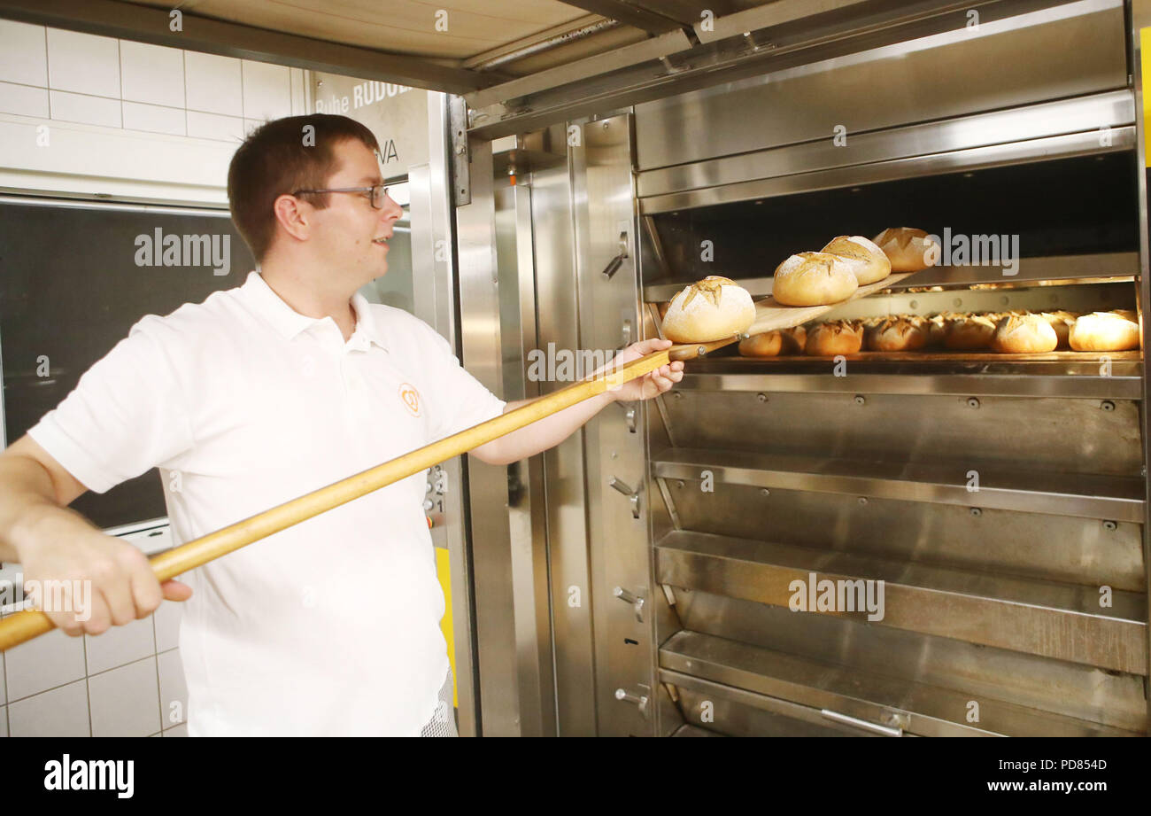 Gera Deutschland 07 Aug 2018 Backer Christian Henkel Holt Frisch Gebackenes Brot Aus Einem Ofen Bei Der Laudenbach Backerei Die Backerei Arbeitet Auch In Zwei Schichten Bei Hohen Temperaturen Im Sommer Credit