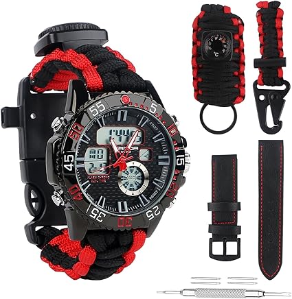 Bluestraw Herren Frauen Survival Analog Digital Uhr Wasserdicht Tactical Dual Time Display Notfall Sports Armbanduhr 5 Zeit Mustern Verstellbar 3 Austauschbare Armbander Alarm Uhr Mit Survival Gear Amazon De Sport Freizeit